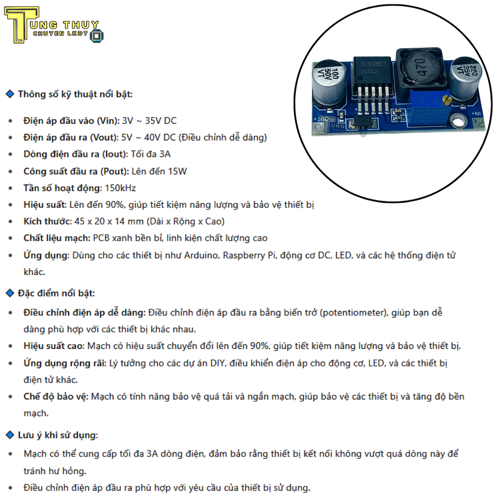 Điện áp đầu ra (Vout): 5V ~ 40V DC (Điều chỉnh dễ dàng)